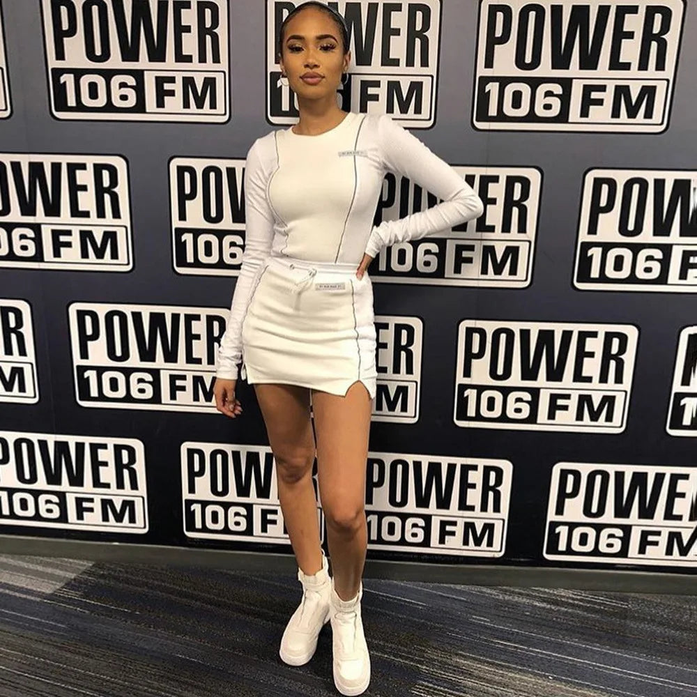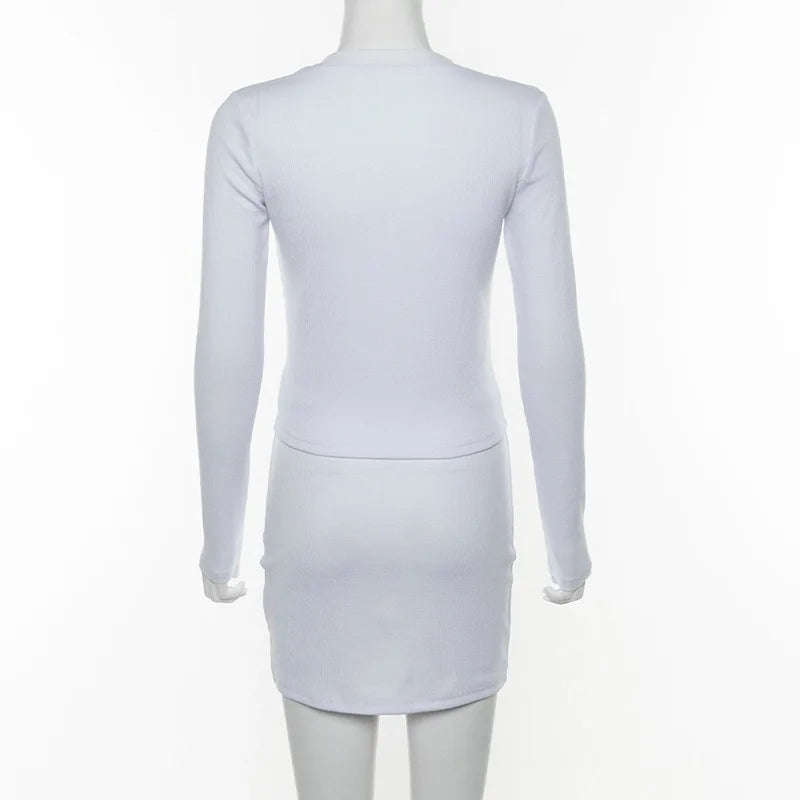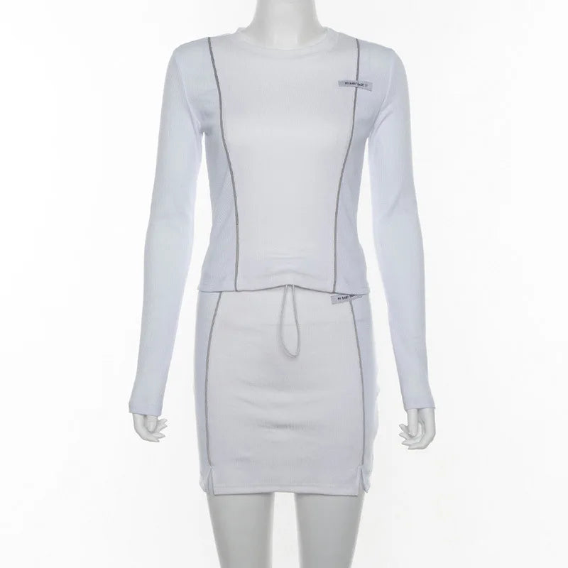 Casual Fashion Reflective Striped Two Piece Outfits Women Long Sleeve Top And Mini Skirt Sets 2020 White Matching Set